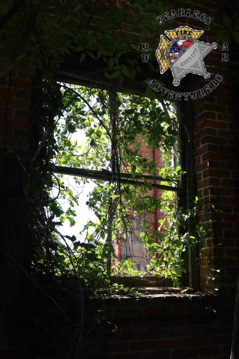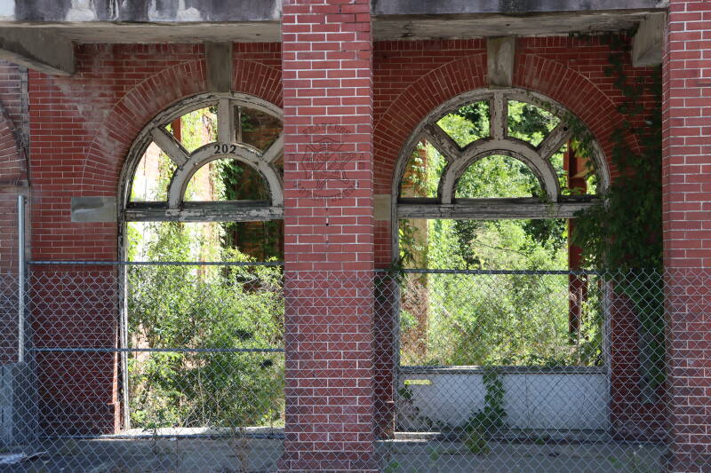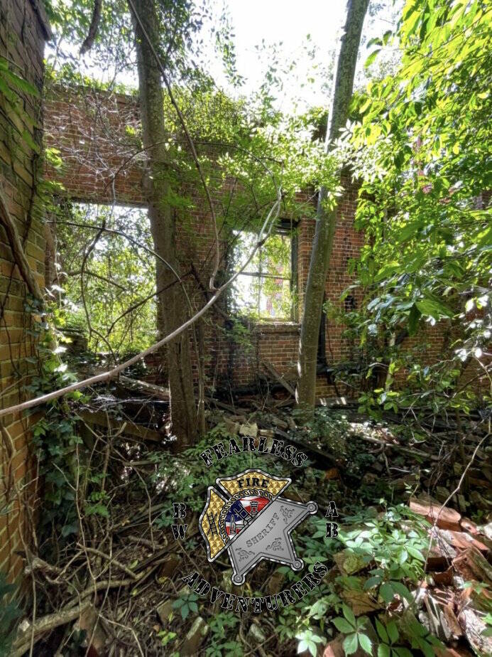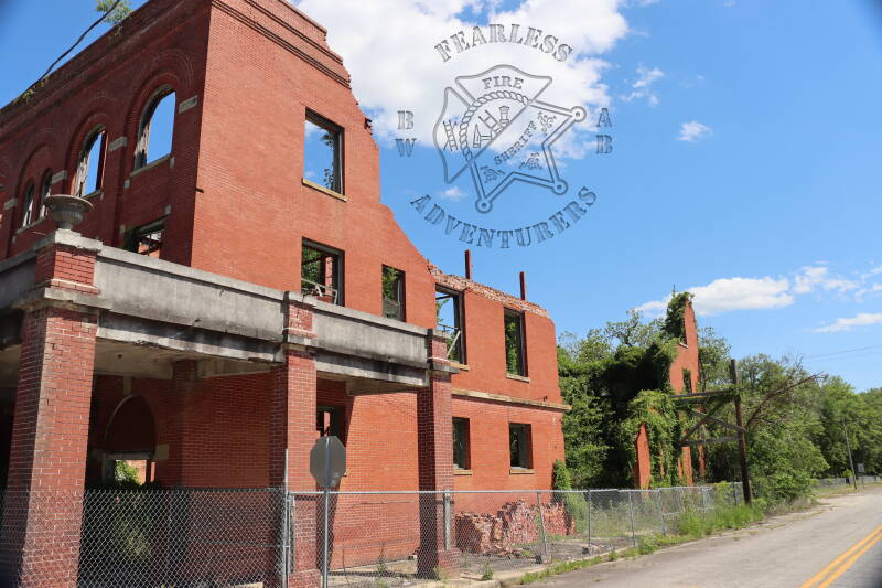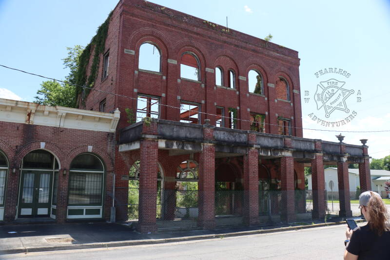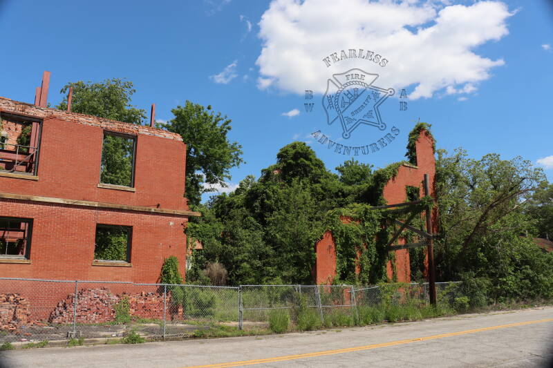 Row of abandoned, partially collapsed buildings in Blackville, South Carolina
